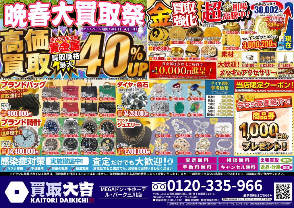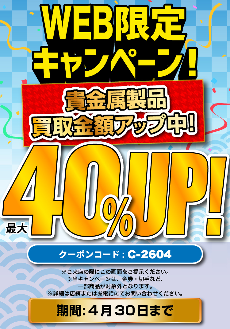 キャンペーン実施店舗 よくあるご質問 買取価格は主にどんな要素から決まるのでしょうか? お品物の状態や付属品の有無、最新相場、流通量などによって買取価格を算出します。 どんなものを買い取ってもらえますか? 金・貴金属・ブランド品はもちろん、お値段がつくか迷われているものも是非お持ちください。 傷や汚れのあるアイテムでも買取可能ですか? 大歓迎です。未使用品などのお持ち込みは少なく、傷や汚れのあるアイテムをお持ちいただく方が半数以上です。状態の悪いお品物やカビなどがあってもお買取可能なケースもございます。 どんな情報があればすぐに査定額を教えてもらえますか? お品物の名前や種類、状態、またはブランド名、型番などの情報があると、概ねの査定額をお伝えできるかと思います。 店舗での査定時間はどのくらいですか? お品物の種類や個数にもよりますが、約5分から30分ほどの査定時間となるケースが多いです。事前にある程度の査定時間をお伝えいたしますので、ご安心ください。